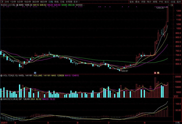 还有一点,目前茅台的股价是1462元,这就是说寒武纪再上涨200元,就完全超越茅台了,如果这种现象真的发生了,到底意味着什么呢?